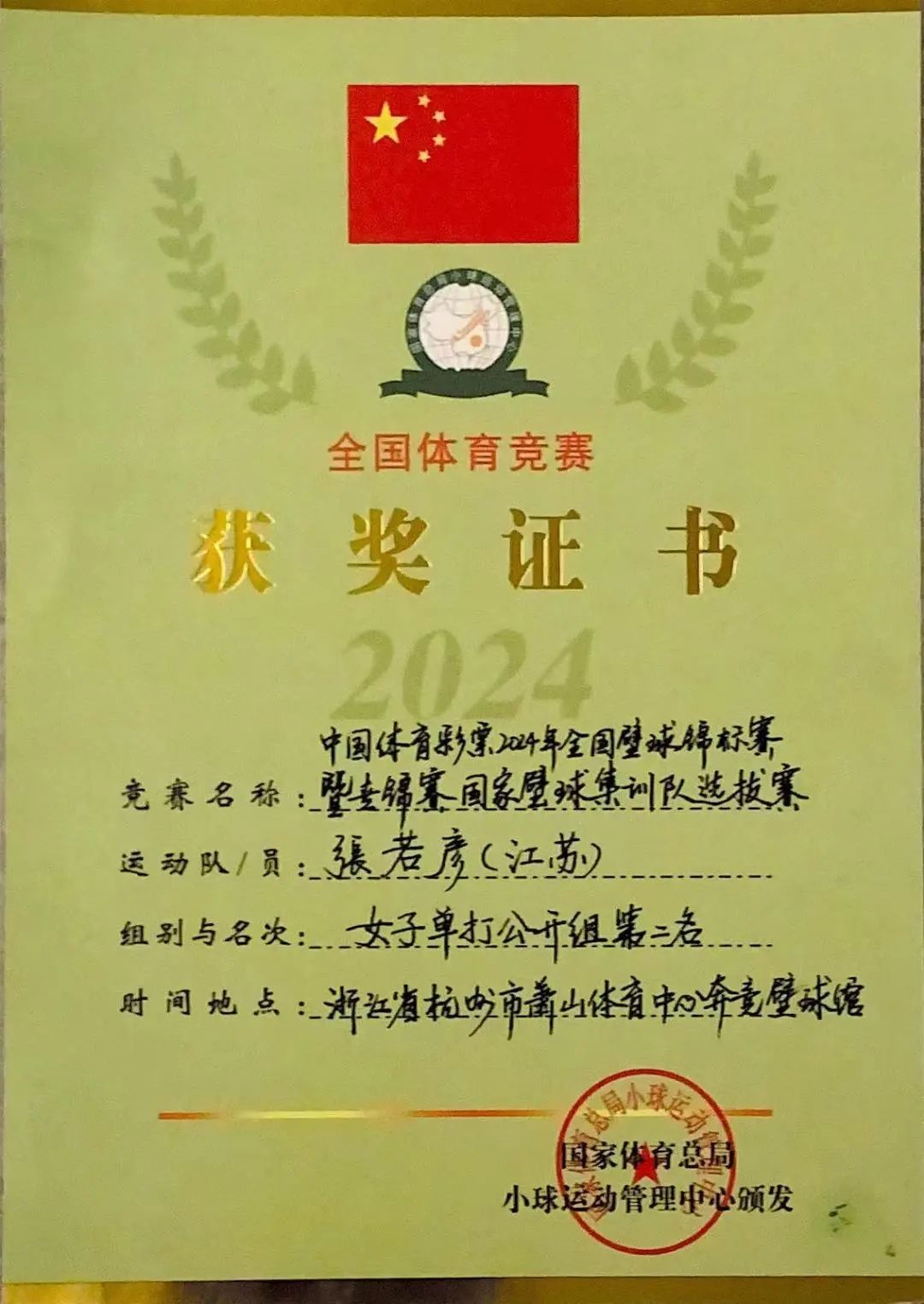 2024年10月16-20日,2024全国壁球锦标赛暨世锦赛国家壁球集训队选拔赛在浙江杭州举行。来自基础教育学院体育教育(高)22的张若彦同学代表盐城幼儿师范高等专科学校参赛,获得女子单打公开组第二名的佳绩。